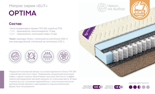 Недорогой популярный матрас на основе пружинного блока TFK 500 с разной жёсткостью сторон. Применение натуральной кокосовой койры с одной стороны обеспечивает высокую жесткость и эффективное распределение весовой нагрузки по спальному месту. Вторая сторона за счет сочетания термовойлока с эластичным пенополиуреатном более мягкая и подстраивается под анатомическую форму тела пользователя. Чехол жаккард «Aries», стеганный на синтепоне (200 г) или жаккард белый, стеганный на синтепоне (100 г).