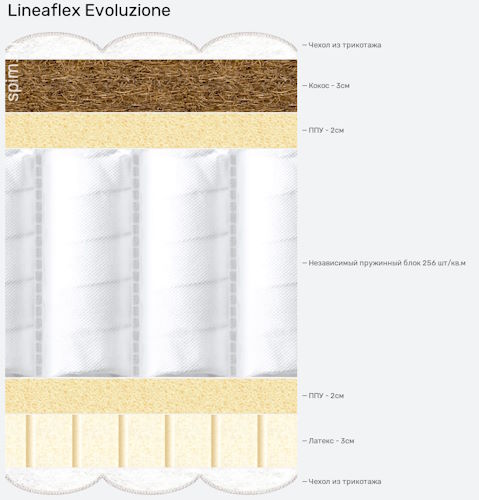 Evoluzione от «Линия Флекс» – ортопедический матрас с независимым пружинным блоком, рассчитанный на одно спальное место. Высота составляет 26 см. Способен создавать индивидуальную поддержку телу человека в разных зонах во время сна. Без проблем подстраивается под вес и комплекцию, потому как каждая отдельная пружина локально реагирует на нагрузку. Допустимый вес – 120 кг.